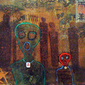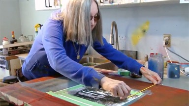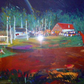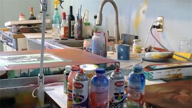 Three large rambunctious dogs greet the visitor to Jane’s studio, a bungalow turned into painting workshops. The living room, painted a bright blue and well lit by a picture window, contains artist’s tools: a light table in the corner, a plastic storage unit, and shelves overflowing with tubes of paint, and a TV. Paint is smudged or splattered on the floor, a red handprint is isolated high on one wall, patterns akin to graffiti run down the hallway. In summer and fall the artist’s work on large pieces may spill outside into the yard to take advantage of the open space, the light and plant life that is so important to her work. A self-portrait is propped in the window, and works by artist-friends who have dropped by for paint-ins hang on the walls.